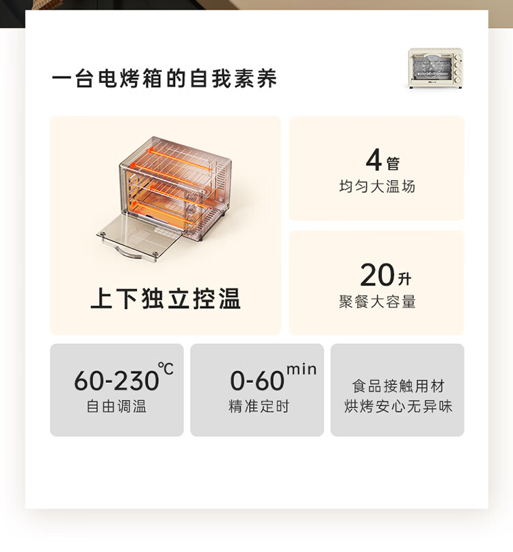 商品名称:小熊(Bear)电烤箱多功能家用迷你小型独立控温20L烘烤蛋糕烤炉烤箱DKX-C20M3