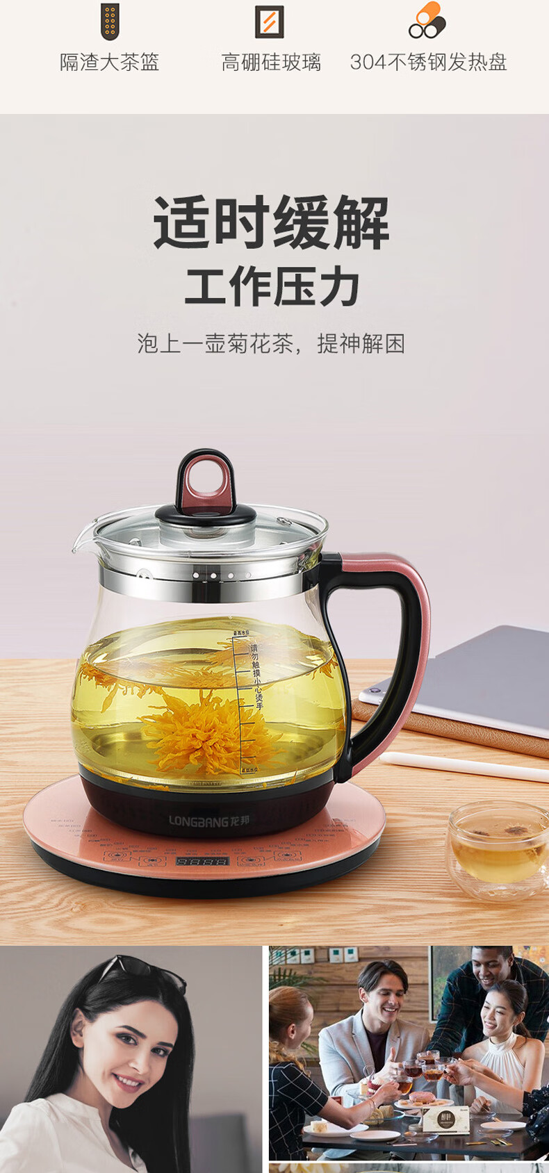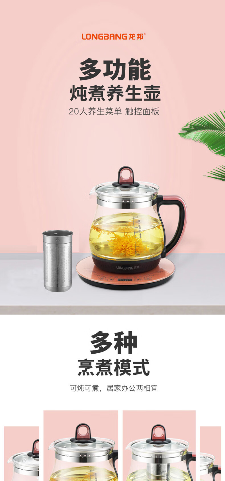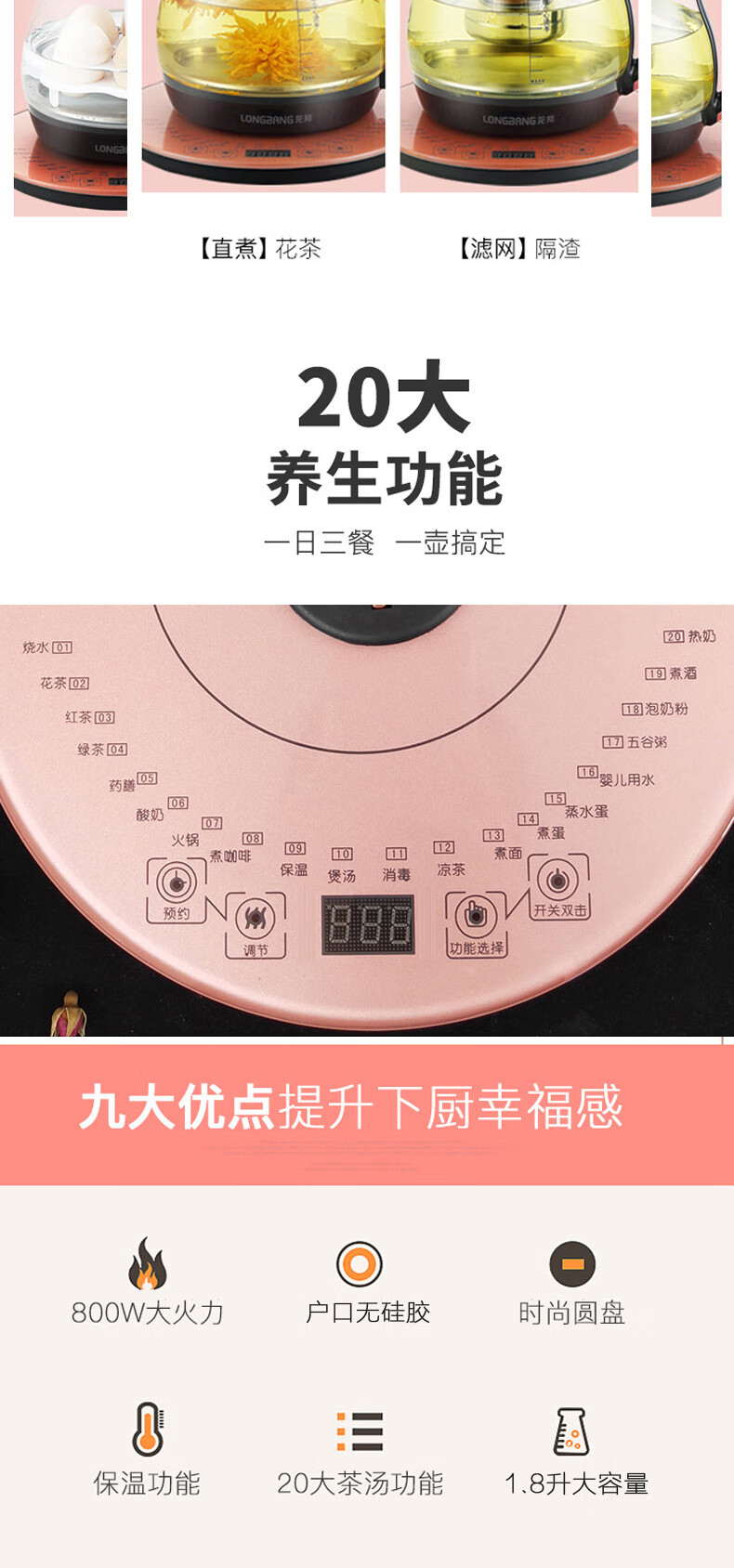 商品名称:龙邦多功能养生壶煮茶壶花茶壶煎药壶全自动家用高硼硅玻璃电热水壶自动保温1.8升大容量丨配滤网 玫瑰金 1.8L